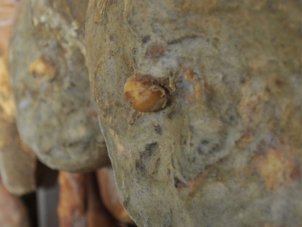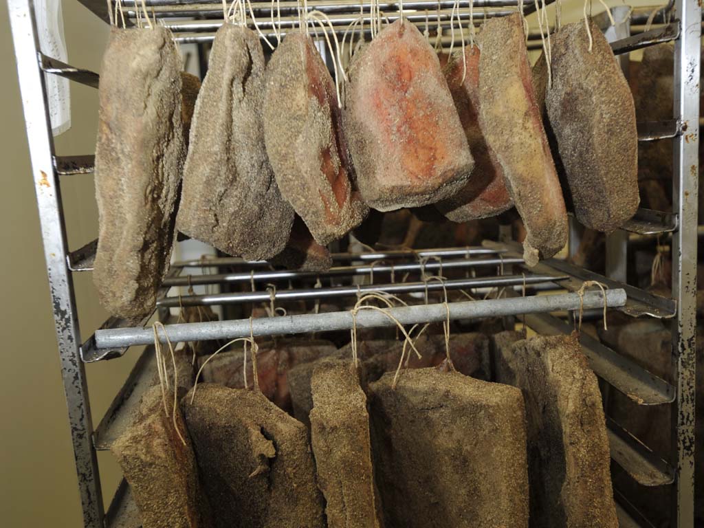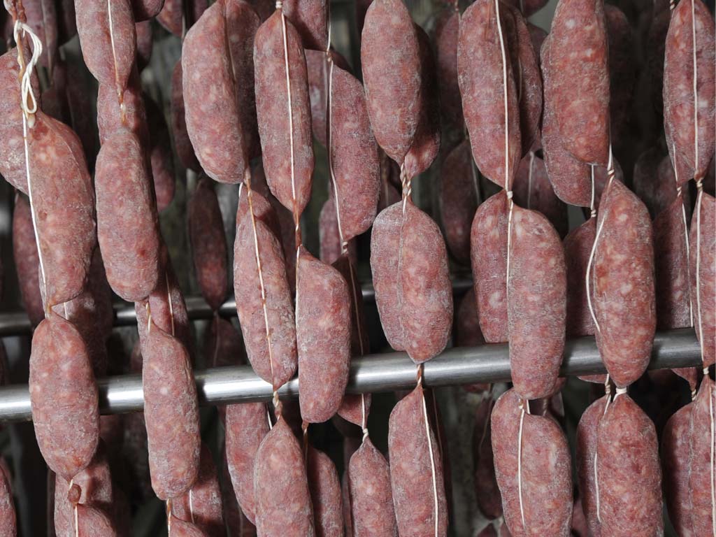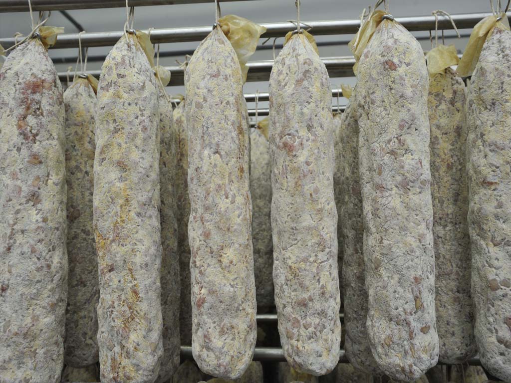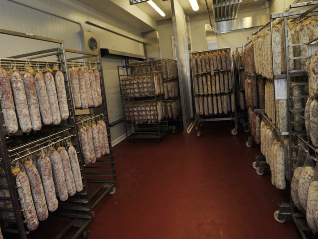 Salami are aged into cells and stored until they are sold, or cut into pieces and vacuum-packed. The building has also a white room for cutting and packaging in ATP (inert atmosphere)